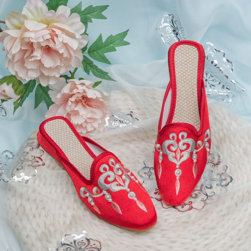 Baotou Sandále Letné Saténové Domáce Papuče Na Nízkom Podpätku Dámske Svadobné Topánky S Mäkkou Podrážkou Výšivky S Cheongsamom Na