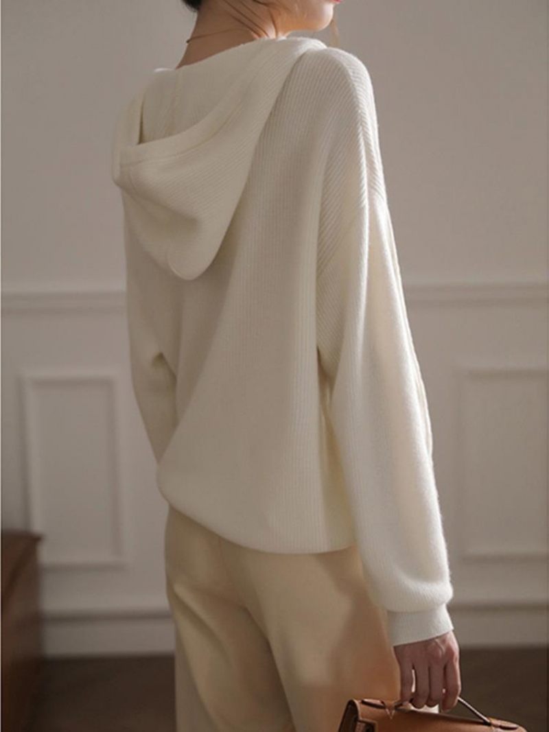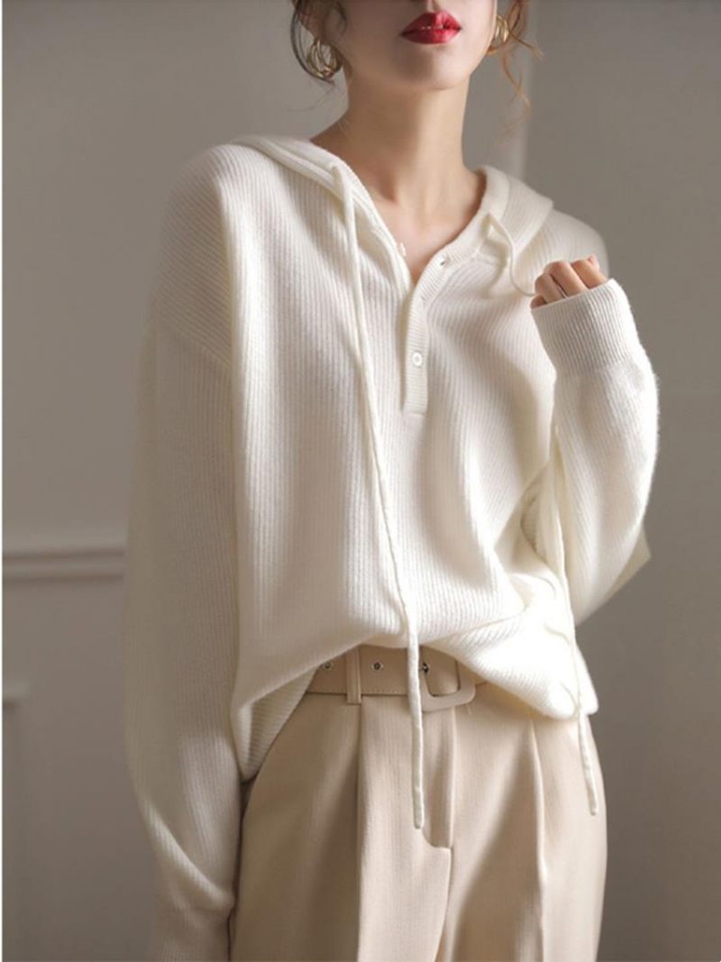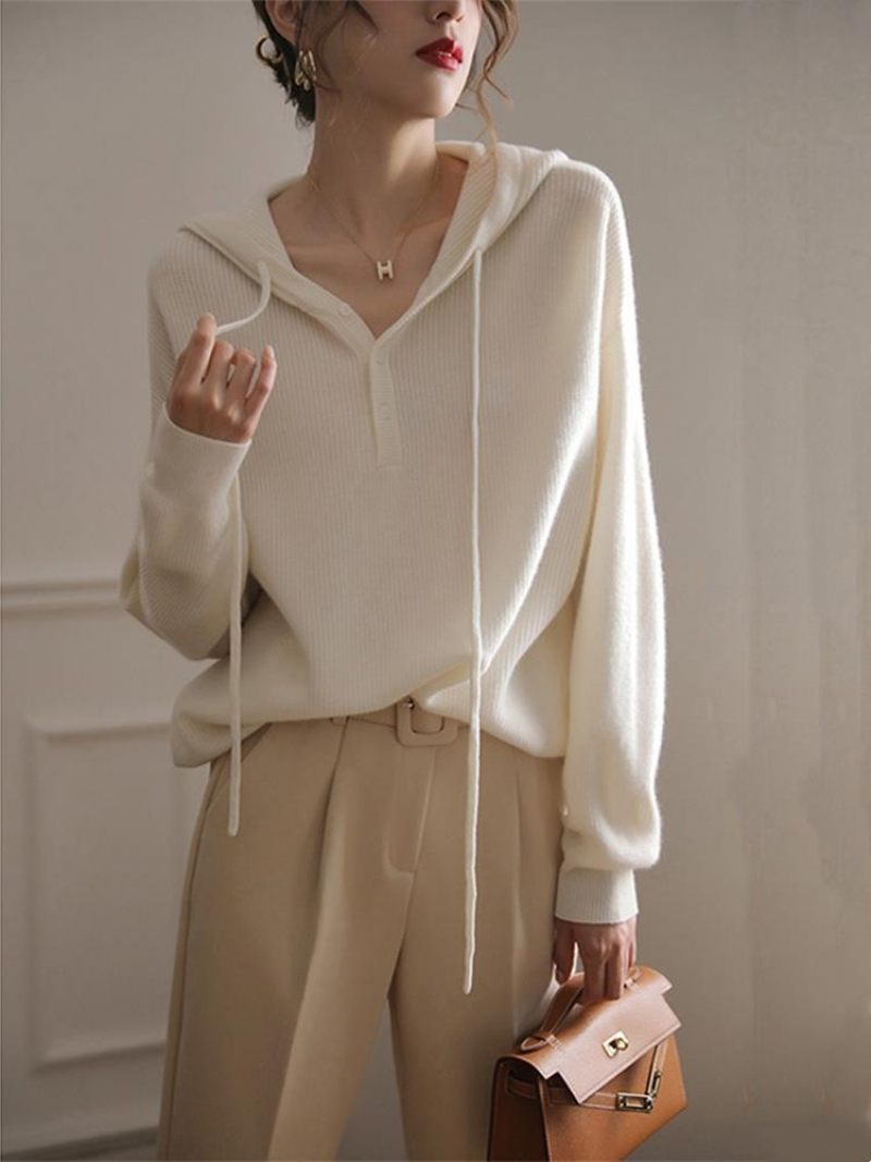 Biele Úplety S Kapucňou Pre Ženy 2023 Nový Sveter Na Jar A Jeseň Lazy Top Tenká Časť S Výstrihom Do V