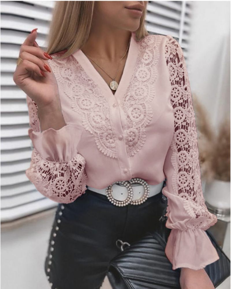 Módna Dámska Blúzka Čipka S Dlhými Rukávmi Do V Výstrih S Čipkou